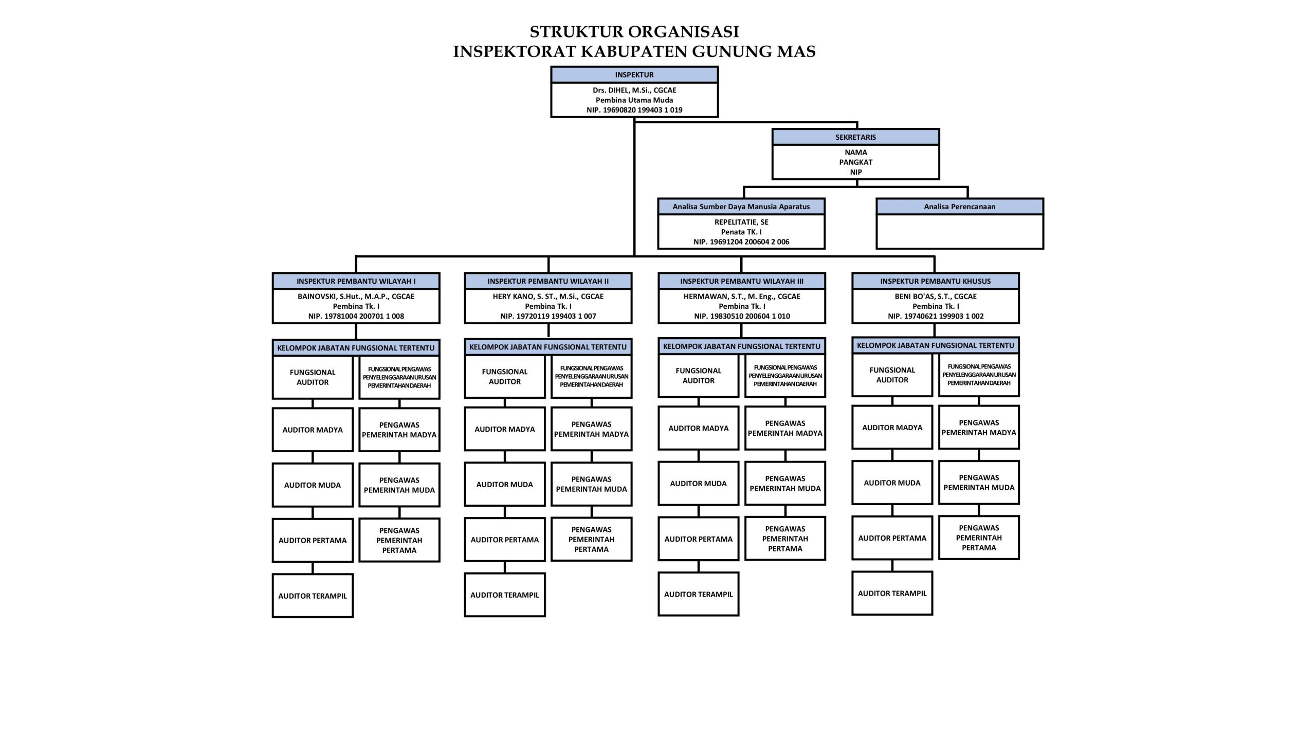 Inspektorat Kabupaten mempunyai tugas membantu Bupati membina dan mengawasi pelaksanaan Urusan Pemerintahan yang menjadi kewenangan Daerah Kabupaten Gunung Mas dan Tugas Pembantuan oleh Perangkat Daerah.